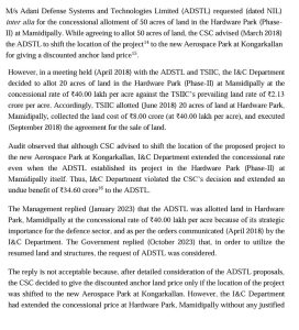 గౌతమ్ అదానీ గ్రూప్ కంపెనీ అదానీ డిఫెన్స్ సిస్టమ్స్కు నగర శివార్లలోని మామిడిపల్లె వద్ద ఎకరా రూ. 40లకే కేసీఆర్ ప్రభుత్వం ఎలా కేటాయిస్తుందని కాగ్ విమర్శించింది. ఒప్పందంలోని షరతులు పాటించకున్నా భారీ రాయితీకి ఇవ్వడంపై కాగ్ తీవ్ర అభ్యంతరం లేవనెత్తింది. కాగ్ నివేదికను రాష్ట్ర ప్రభుత్వం అసెంబ్లీకి సమర్పించింది. అదానీ డిఫెన్స్ కంపెనీ ప్రతిపాదించిన ప్రాజెక్టును కొంగకలాన్కు మారిస్తేనే రాయితీ ధరకు భూములు కేటాయిస్తామని మంత్రివర్గ ఉపసంఘం(సీఎస్సీ) నిర్ణయించిన విషయాన్ని కాగ్ ప్రస్తావించింది. ఇదే విషయాన్ని కంపెనీకి తెలిపారని పేర్కొంది. అందుకు విరుద్ధంగా కొంగరకలాన్కు మార్చకున్నా… మామిడిపల్లె వద్ద ఎకరాకు రూ. 40లక్షల ధర ఎలా నిర్ణయించారని నిలదీసింది. అక్కడ ఎకరా మార్కెట్ ధర అప్పట్లో అంటే 2018లో రూ. 2.13 కోట్లని కాగ్ పేర్కొంది. కంపెనీకి 20 ఎకరాలు కేటాయించడం వల్ల అదాని డిఫెన్స్కు రూ.34.60కోట్ల లబ్ధి చేకూరిందని కాగ్ పేర్కొంది. అదానీ డిఫెన్స్, TSIIC మధ్య 2018 జూన్ నెలలో ఒప్పందం కుదరగా, సెప్టెంబర్లో భూ విక్రయ ఒప్పందం కుదిరిందని కాగ్ వెల్లడించింది. ఢిఫెన్స్ రంగానికి చెందిన కంపెనీ కావడం వల్ల రాయితీ ధరకు భూమి కేటాయించినట్లు 2023 అక్టోబర్లో రాష్ట్ర ప్రభుత్వం ఇచ్చిన వివరణను కాగ్ తోసిపుచ్చింది. ప్రభుత్వ సమాధానం ఏమాత్రం ఆమోదయోగ్యం కాదని పేర్కొంది. ప్లాంట్ పెట్టే ప్రాంతాన్ని మార్చితేనే రాయితీ ధరకు భూమి ఇస్తామని కంపెనీకి రాష్ట్ర ప్రభుత్వం స్పష్టంగా తెలిపిన విషయాన్ని ప్రస్తావించింది. అయినా మామిడిపల్లెలోనే రాయితీ ధరకు స్థలం ఎలా కేటాయిస్తారని నిలదీసింది.