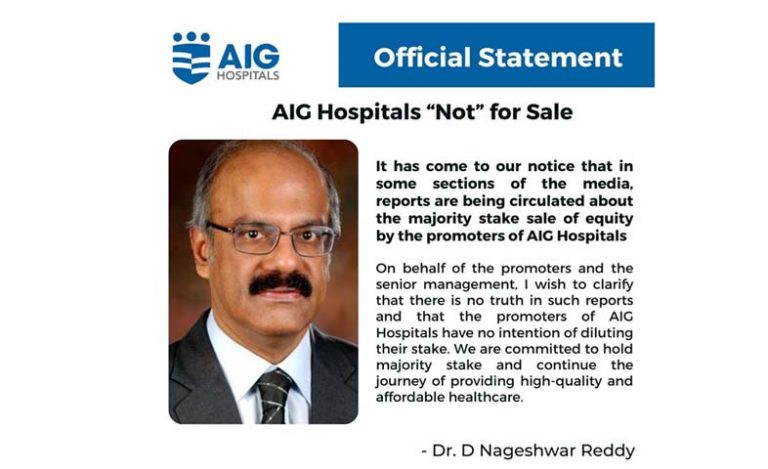 ఏఐజీ హాస్పిటల్స్ ఈక్విటీలో మెజారిటీ వాటా అమ్మేస్తున్నట్లు మీడియాలో వచ్చిన వార్తలు నిజం కాదని ఆ సంస్థ ఛైర్మన్ డాక్టర్ డి నాగేశ్వర్ రెడ్డి అన్నారు. ఈ...