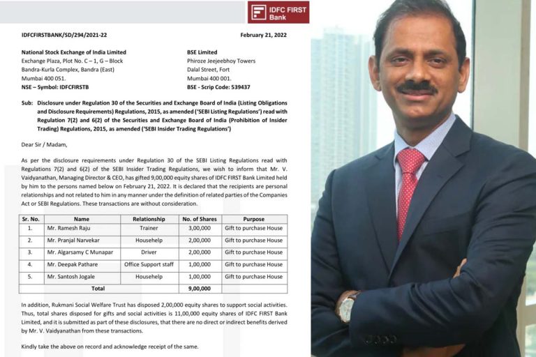 ఐడీఎఫ్సీ ఫస్ట్ బ్యాంక్ ఎండీ, సీఈఓ వైద్యనాథన్ సుమారు రూ.4.82 కోట్లకు పైగా విలువైన 11 లక్షల బ్యాంక్ షేర్లను తన వద్ద పనిచేస్తున్న సహాయకులు, ఓ...